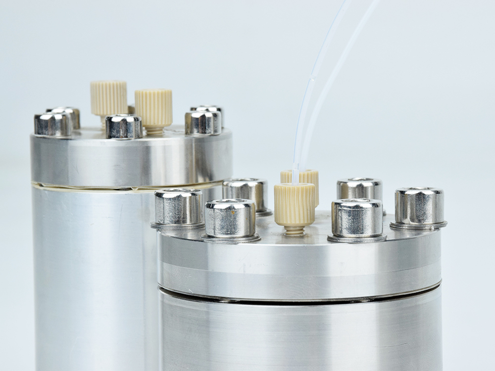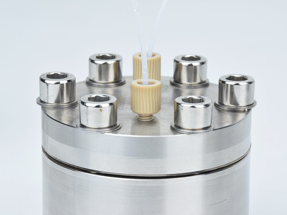 脉冲阻尼器 FS050输出端软管连接到阻尼器输入,在输出端接头处连接一根输出软管至容器,即构成一个典型应用模式。适用流量范围:50ul/min-50ml/min,10-32unf螺纹1/16管接头;启动柱塞泵,水流通过阻尼器时,这时由于流体压力的作用,水流的湍流经过整流,消除柱塞切换产生的脉动,平稳输出。