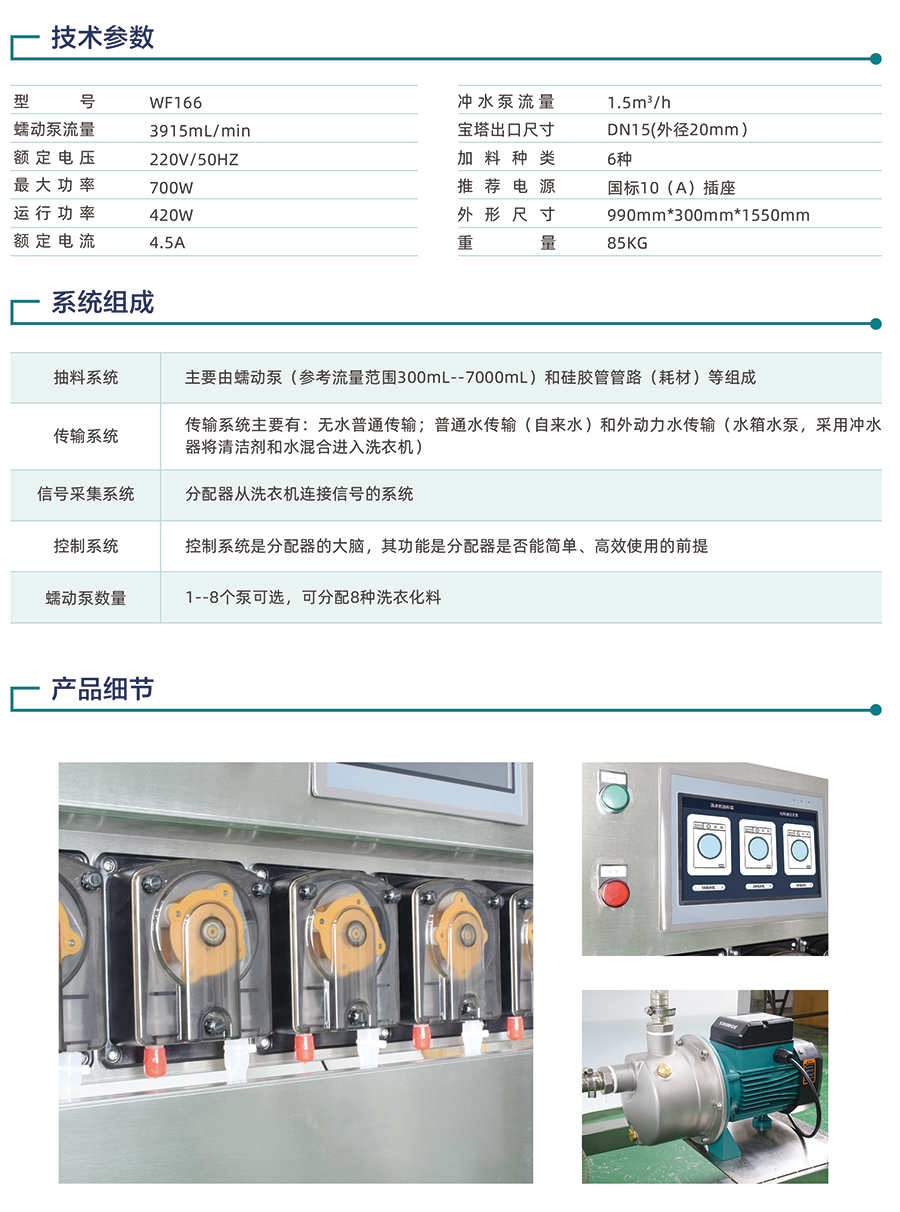 5) 蠕动泵数量:1--8个泵可选,可分配8种洗衣化料。